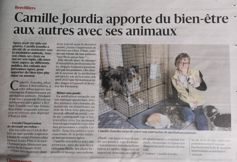 Aide soignante à domicile pendant 11ans, et passionnée d'animaux depuis ma plus jeune enfance, je me suis décidée de me lancer dans une activité indépendante : la zoothérapie.